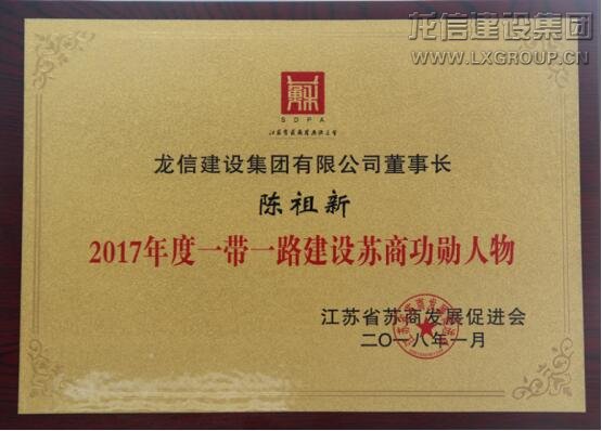 1月19日,由江蘇省蘇商發(fā)展促進(jìn)會(huì)主辦的“2018年(第12屆)蘇商領(lǐng)袖年會(huì)暨2017年蘇商人物系列推選頒獎(jiǎng)典禮”在南京隆重舉行。龍信集團(tuán)董事長(zhǎng)陳祖新榮獲“2017年度一帶一路建設(shè)蘇商功勛人物”稱號(hào)。