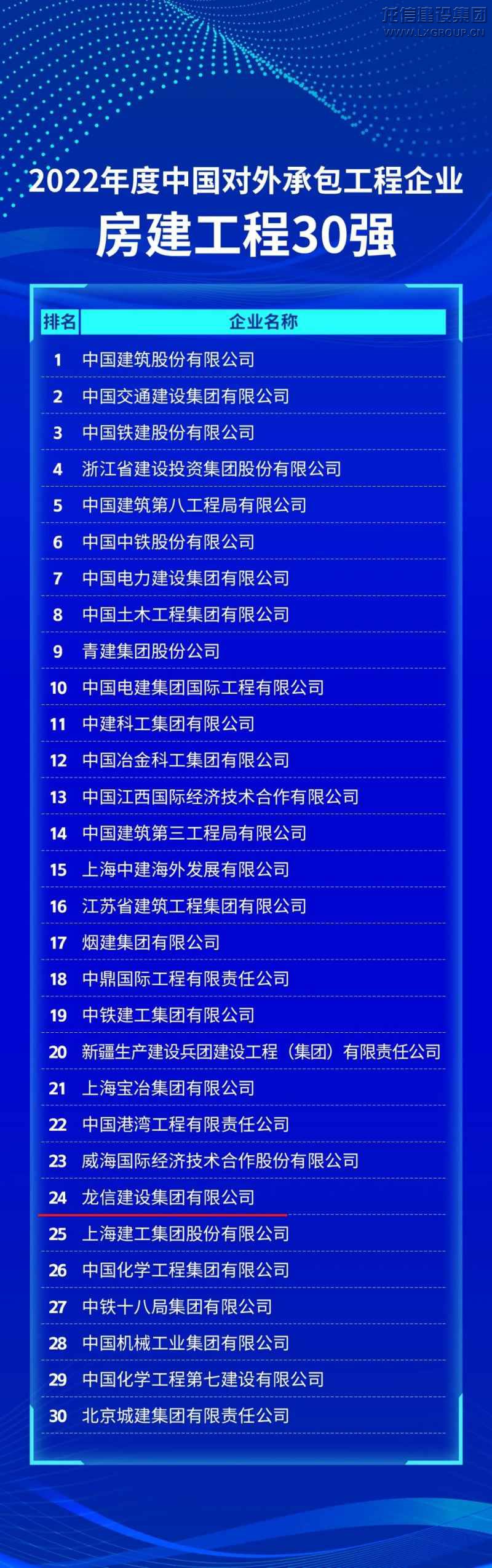 龍信建設集團榮登2022年度中國對外承包工程企業(yè)100強及房建工程30強榜單
