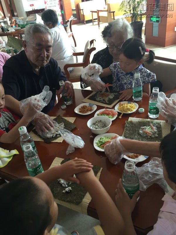 表演結(jié)束后,小朋友們用小手牽著爺爺奶奶的手,一起到樂頤薈餐廳制作壽司。他們與爺爺奶奶們圍桌而坐,為爺爺奶奶們捶背按摩,長者們更是拉著孩子們的手,對孩子們寵愛有加,老少同樂。長者與小朋友們分享了親手制作的壽司??粗@其樂融融的場景,我們不禁聯(lián)想,善待現(xiàn)在的長者,就是善待以后的自己。